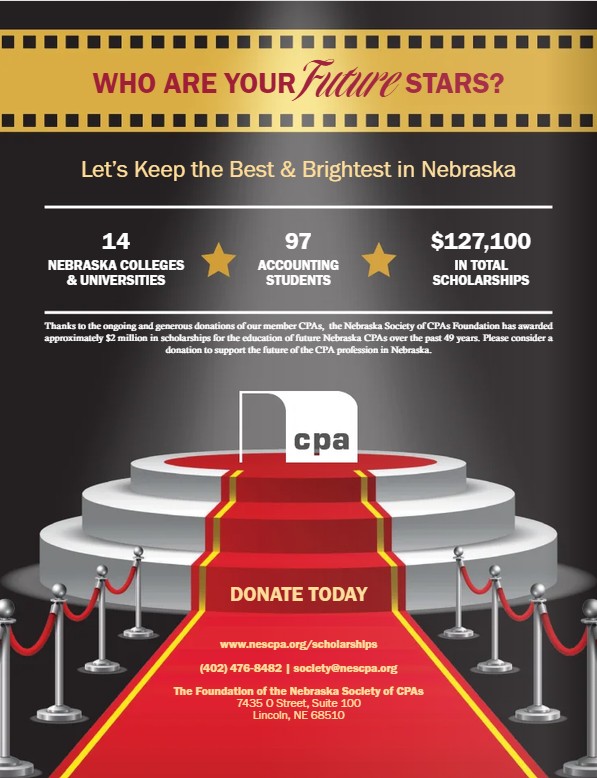 Since 1976, the Foundation of the Nebraska Society of CPAs has supported the future of the CPA profession in Nebraska by sponsoring scholarships for accounting students attending Nebraska colleges and universities.